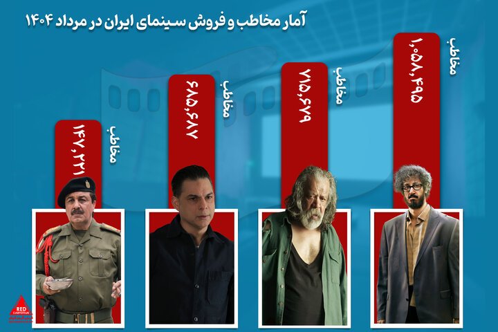 همچنین فیلمهای «مرد عینکی» با ۱ میلیون و ۵۸ هزار و ۴۹۵ تماشاگر، «پیر پسر» با ۷۱۵ هزار و ۶۷۹ تماشاگر، «زن و بچه» با ۶۸۵ هزار و ۶۸۷ مخاطب و «صددام» با ۱۴۷ هزار و ۲۲۱ مخاطب، به ترتیب بهعنوان ۴ فیلم پرمخاطب مرداد در سراسر کشور معرفی شدند.